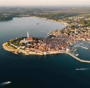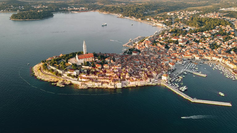 Samo kratka vožnja od Pule vodi vas do Rovinja, grada koji izgleda kao da je naslikan na Jadranu. Kaldrmisane ulice vijugaju do crkve svete Eufemije, dok pastelne kuće stoje priljubljene, kao da šapuću tajne. Ribari i dalje donose svjež ulov, a večeri su najbolje uz čašu malvazije dok sunce tone u horizont.